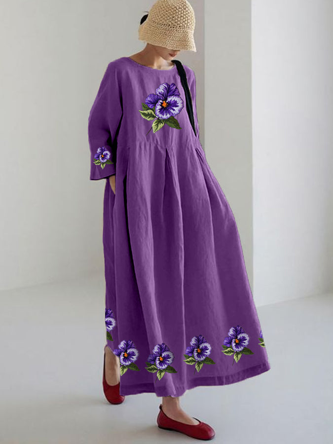 Women's Purple Pansy Print Alzheimer's Awareness Support Long Sleeve Dress