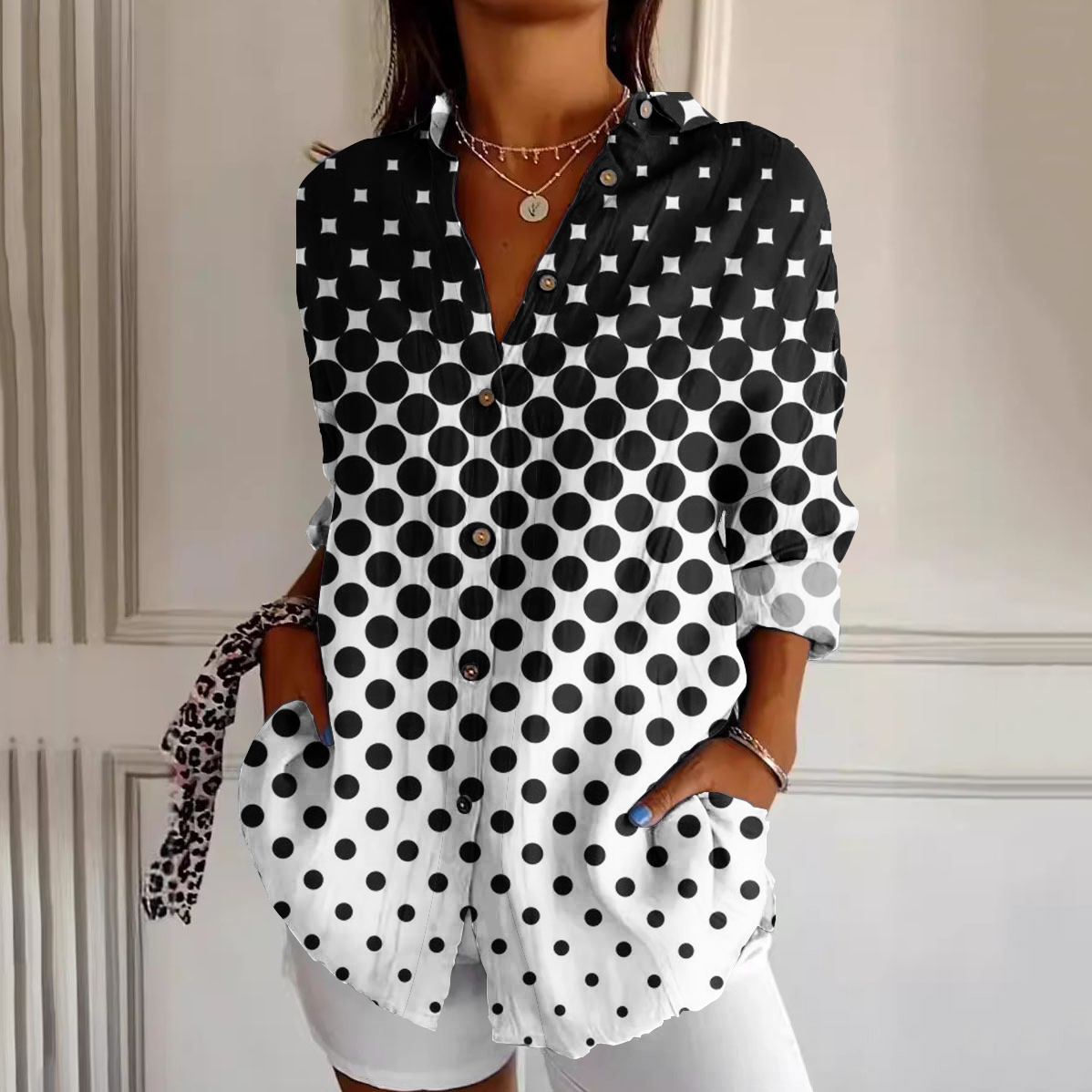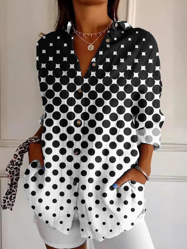 Women's Black And White Polka Dot Art Button Shirt