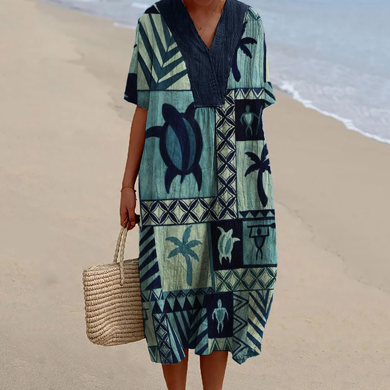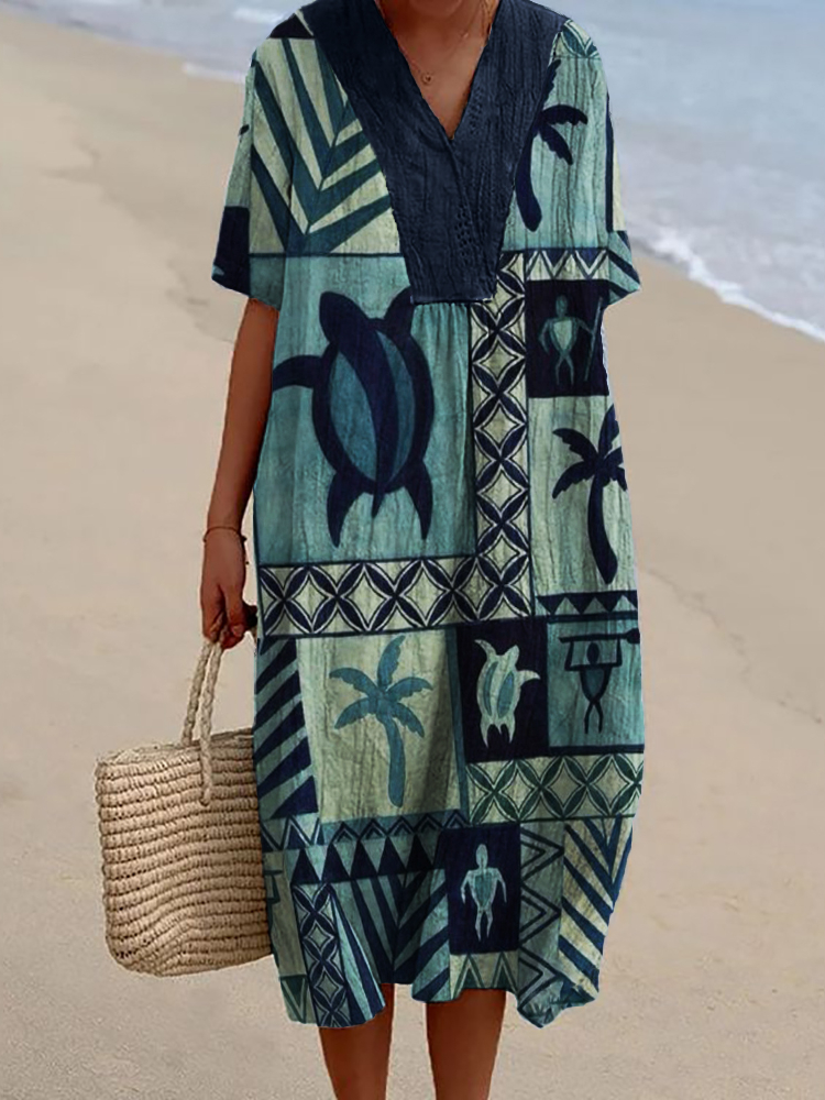 Sea Turtles & Palm Trees Geometric Art Flowy Linen Blend Dress