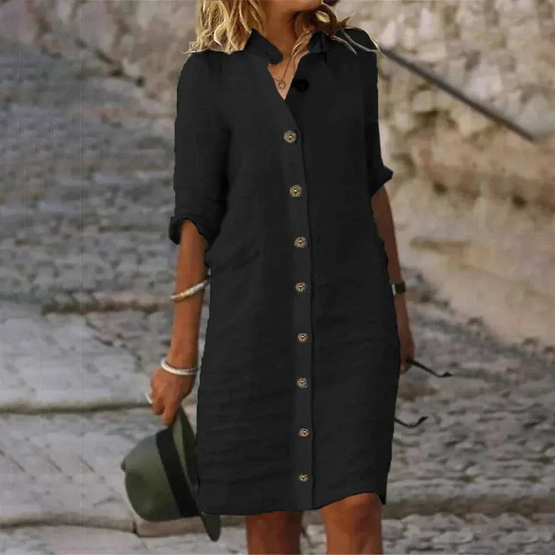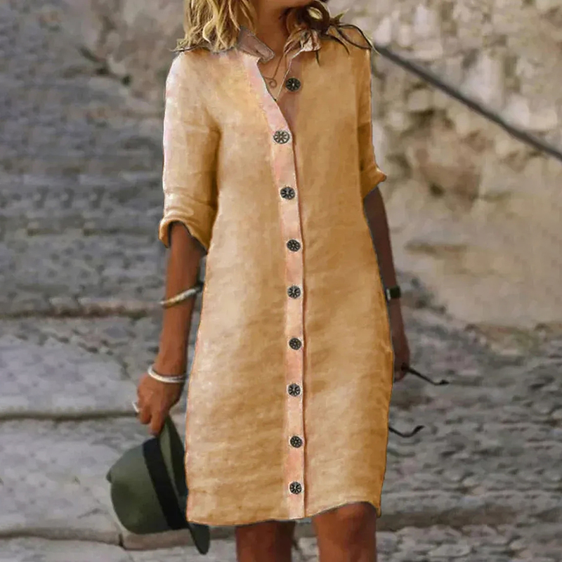 • Women'S Shirt Collar Half Sleeve Cotton Linen Midi Dress
